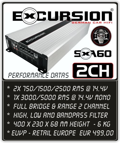 1 ohm stabiele en ultramoderne FULL BRIDGE-technologieën gecombineerd met uitstekende FULL RANGE-prestaties maken onze nieuwe versterker van de SXA PRO STREET-serie de perfecte keuze voor alle PRO AUDIO- en standaard CAR AUDIO-opstellingen. Volledig microgestuurde voeding, solide dubbellaagse printplaat met SMT-processen met recordwaarden in termen van prestatie-efficiëntie. Met een nieuw koellichaamontwerp in een klassieke look maar met maximale functie blijft de SXA PRO ook trouw aan de filosofie van de legendarische HXA-broers. Maar hier aan de “heldere” kant van de EXCURSIE “MACHT” met een gedraaide ministrategie die zich richt op bijzonder korte lengtes in plaats van een smalle breedte.Deze SXA PRO-versterkers zijn echter compact en intelligent en met de hoogste efficiëntie en kunnen niet langer zonder extra mechanische luchtkoeling en thermische statusbewaking met het oog op deze ongelooflijke uitgangsvermogen om meltdown te voorkomen. Het is de technologische oerknal van een nieuwe generatie Living Loud Car Audio die zichzelf niet zo serieus wil nemen en veel plezier wil.